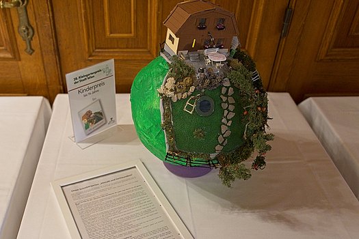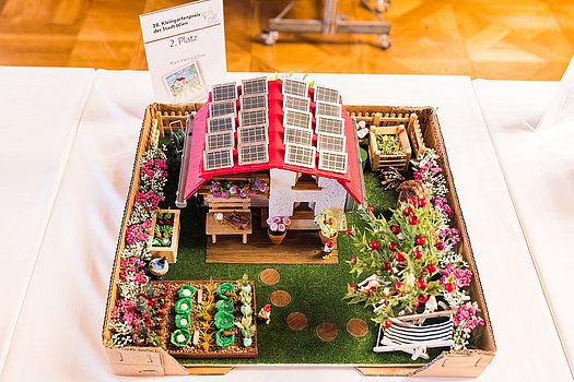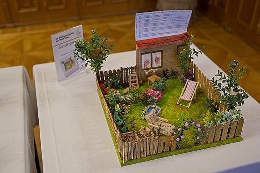 Friederike Mihajlovic hat mit ihrer Bastelarbeit ein horizontales 3D-Bild von ihrem Kleingarten geschaffen. Auf einer ca. 40x40 cm großen Leinwand hat sie ihren Garten samt Haus und zahlreichen liebevollen Details nachgestellt. So findet man hier Gartenmöbel genauso wie Tiere, Blumen und Gemüsebeete. In einer beigefügten Erklärung beschreibt sie, warum ihr Garten ein naturnaher Erholungsort ist und welche Pflanzen und Maßnahmen ihrerseits zum Umweltschutz beitragen.