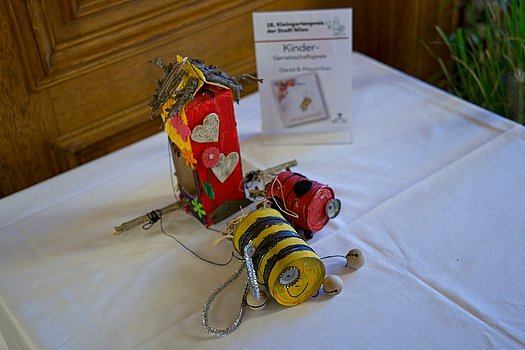 Im Kleingarten von David und Maximilian sind alle willkommen – vor allem die Tiere. Aus diesem Grund haben sie aus leeren Dosen eine Biene und einen Marienkäfergebastelt, damit jeder sehen kann: Hier finden auch die kleinsten Gartenbewohner ein Zuhause.