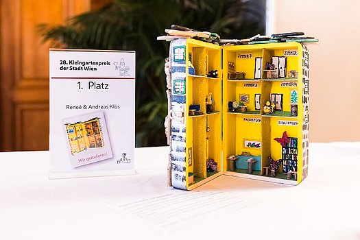 Karl-Heinz Löwy hat seinen Kleingarten in Miniaturform nachgebaut: Am Dach des zweistöckigen Hauses findet man Solarpaneele, daneben eine Klimaanlage und eine Regentonne zum Auffangen des Regenwassers. Insektenhotel und Komposthaufen dürfen genauso wenig fehlen wie Hoch- und Gemüsebeete. Sogar der Gartenschlauch wird aus einem Wasserreservoir gespeist. Und im Vordergrund entspannt sich der Herr des Hauses in einem Liegestuhl und genießt die Früchte seiner Arbeit.