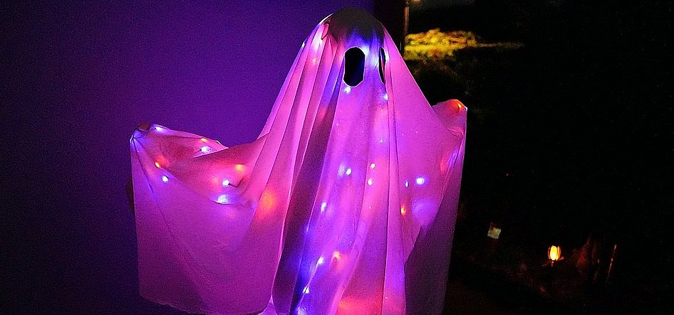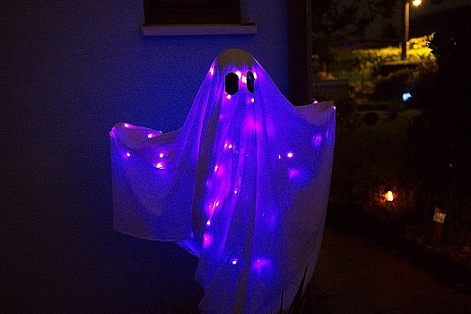 Wir haben den Verlauf der Lichterkette so eingestellt, dass abwechselnd nur die orangen oder lilafarbenen LED’s verblassen bzw. erscheinen. So kommt aus dem Dunkel einmal ein orangener oder ein lila Geist und der Überraschungseffekt ist höher