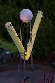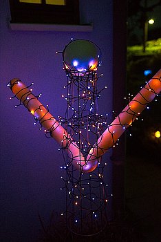 Auf das fertige Gerüst des Körpers haben wir eine orange-lila Lichterkette mit Solarfunktion angebracht. Diese Lichterkette wickelt man um die Schwimmnudel und um den Kopf. Die einzelnen LED’s versucht man möglichst gleichmäßig anzuordnen. Nach unserem Geschmack sollte nur wenige Elemente der Lichterkette direkt an der Ranksäule angebracht werden, da so der Geist mehr aus dem Inneren leuchtet.