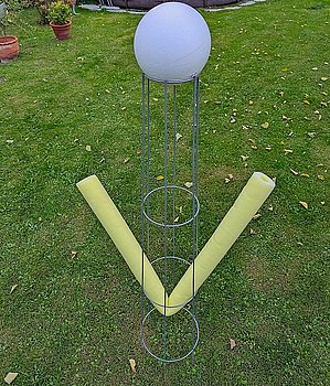 Nun wird die Schwimmnudel im oberen Drittel durchgeführt, in der Mitte geknickt und so weit nach unten geführt, dass die Arme in einem Winkel von ca. 30-40 Grad abstehen. Damit die Arme in der Position bleiben kann man einen kleinen Ast oder ähnliches in den Knick stecken und mit Gewebeband fixieren. Auch an der Stelle wo die Arme aus der Ranksäule heraustreten, sollte man eine Schnur zum festbinden verwenden.